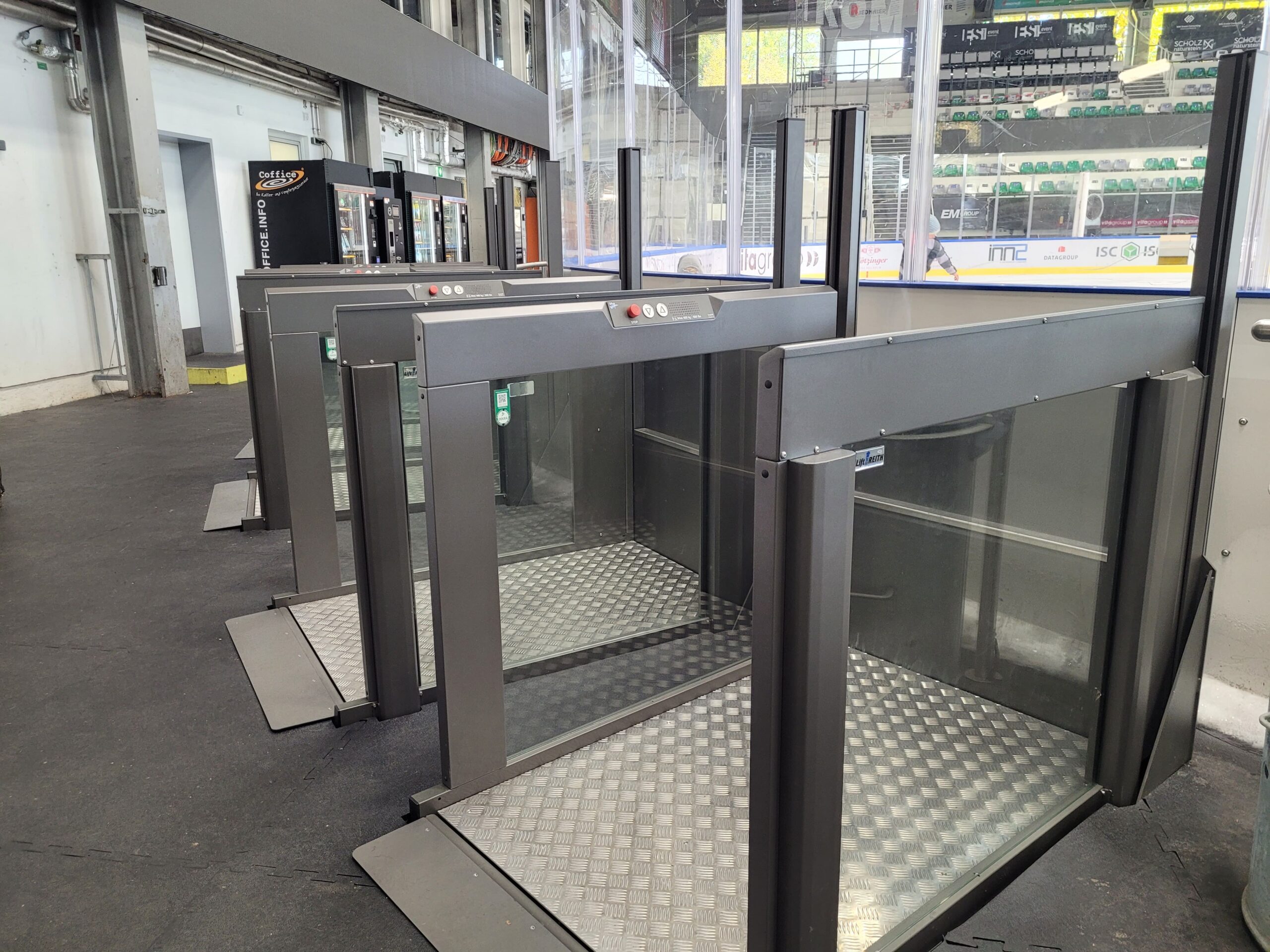 • Eisstadion der Rosenheimer Starbulls – Easy Lift Hubbühne für Rollstuhlfahrer Für das Eisstadion des bekannten bayerischen Eishockeyvereins lieferte und montierte Lift Reith eine Easy Lift Hubbühne, die Rollstuhlfahrern den stufenlosen Zugang zu den Zuschauerrängen ermöglicht. Barrierefreiheit im Sportbereich stellt besondere Anforderungen an Stabilität, Witterungsbeständigkeit und Bedienkomfort – alle erfüllt.
